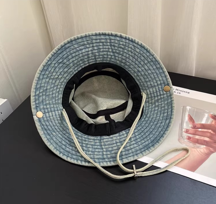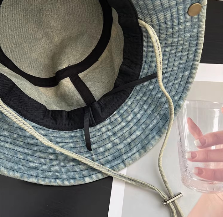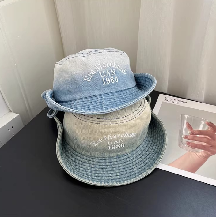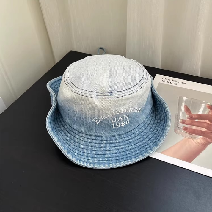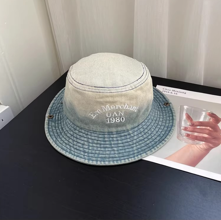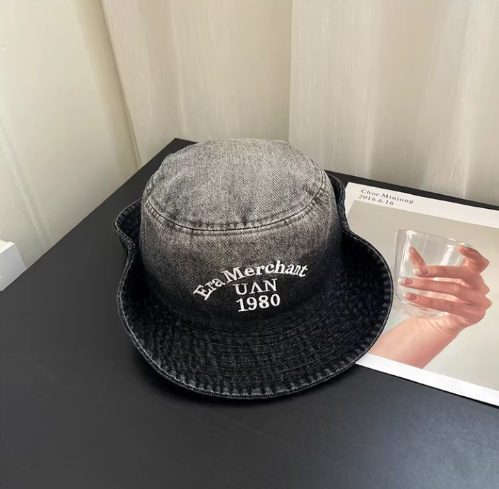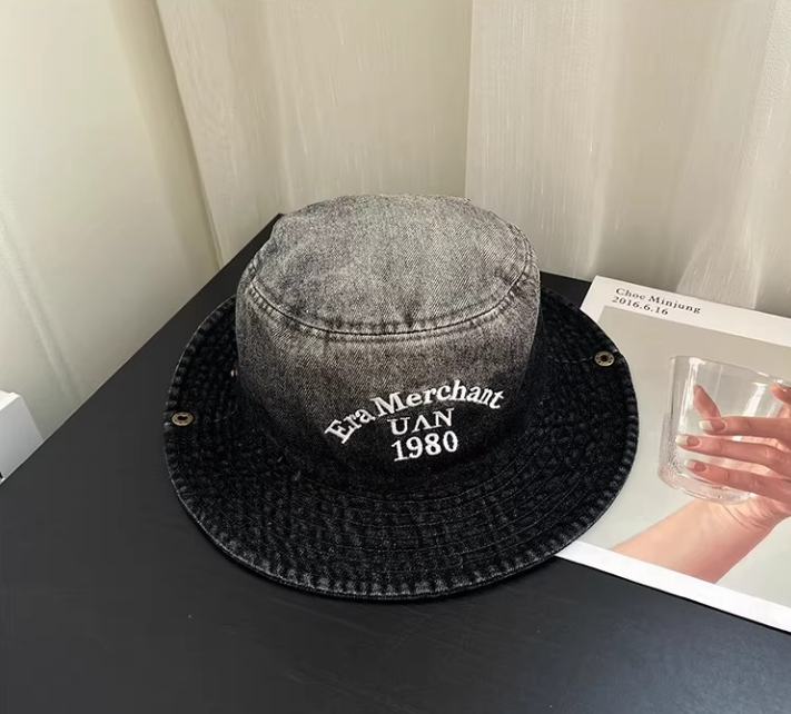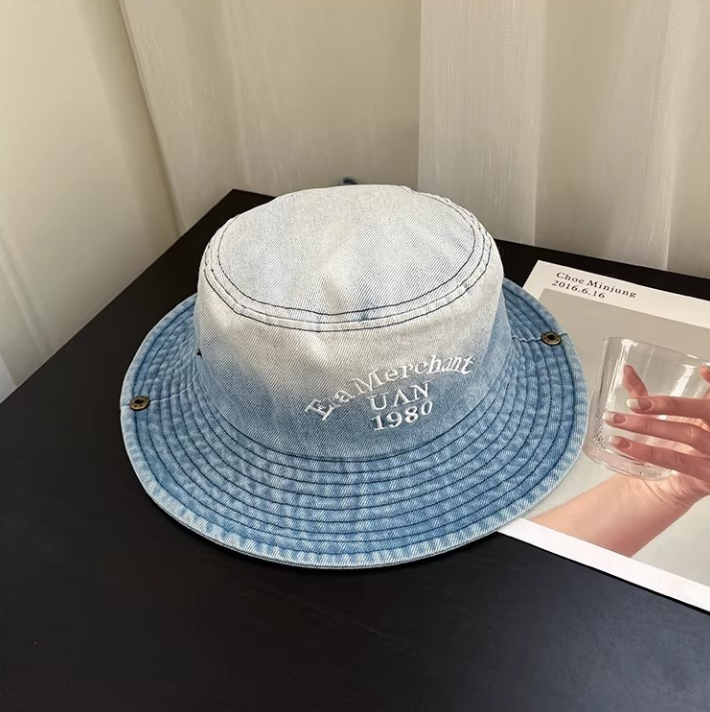 Vintage Washed Denim Bucket Hat "Era Merchant 1980" Embroidered Retro Fisherman Cap for Men Women